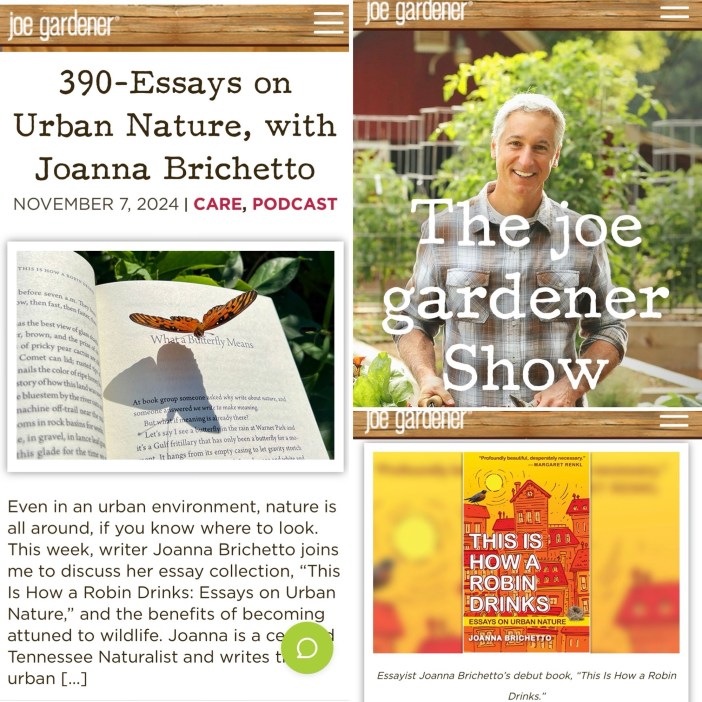 “Nashville resident and naturalist Joanna Brichetto defends her urban home, arguing it is a perfect spot to fall in love with the wonder of insects, birds, trees, and plants. If she’s the attorney in this case, consider her book This is How a Robin Drinks: Essays on Urban Nature a powerful opening statement…